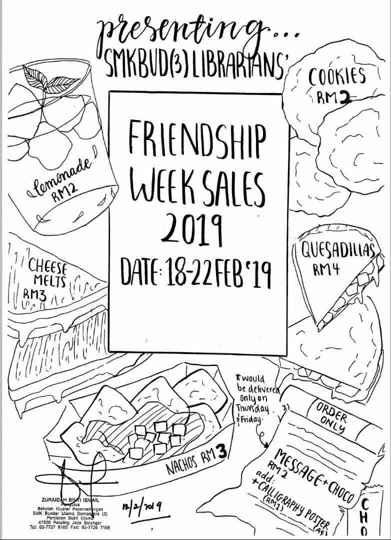 On the 18th till the 22nd of February 2019 , SMK BU3’s librarians have set up a friendship week sales whereby varieties of food were sold by the fellow librarians. Food sold by us were quesadillas , nachos , cheese melts , cookies , lemonades and many more.